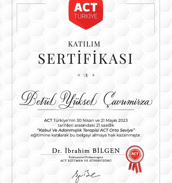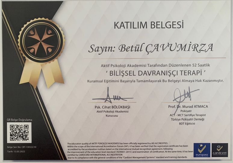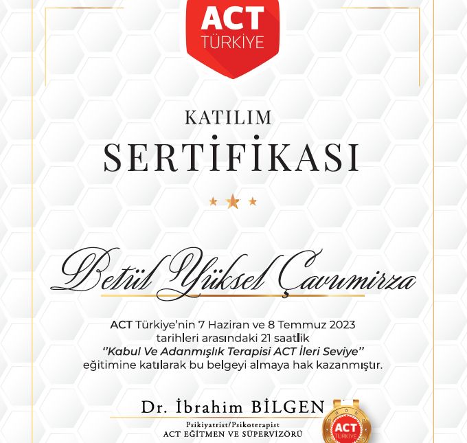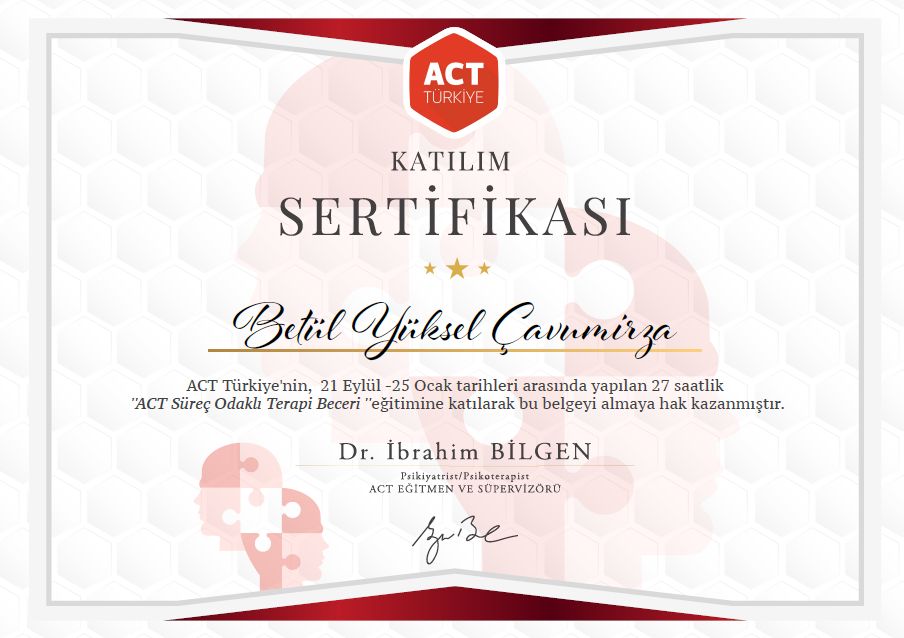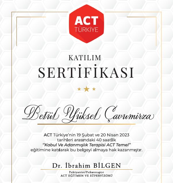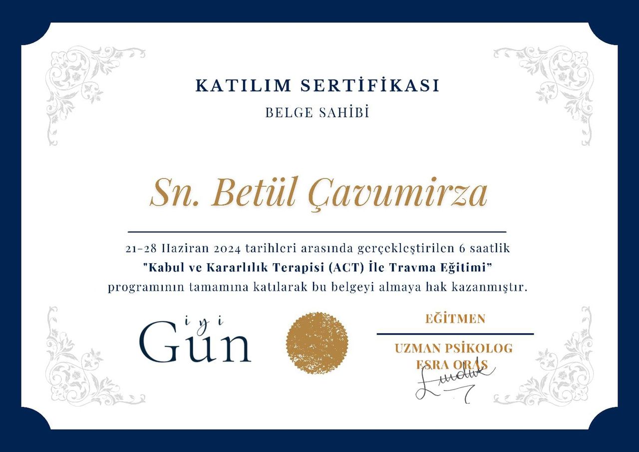 Psikolog Betül Çavumirza, psikoloji lisans eğitimini Fransa’da Institut de Psychologie René Descartes’ta tamamlamıştır. Akademik süreci boyunca uluslararası çalışma ortamı tecrübelerini, klinik staj ve süpervizyon deneyimleriyle birleştirmiştir. Özellikle Bilişsel Davranışçı Terapi (BDT) ve Kabul ve Kararlılık Terapisi (ACT)alanında derinleşerek, danışanların kişisel ve kişiler arası süreçlerinde bilimsel temelli ve kişiye özel bir psikoterapi yaklaşımı sunmayı önemsemektedir.